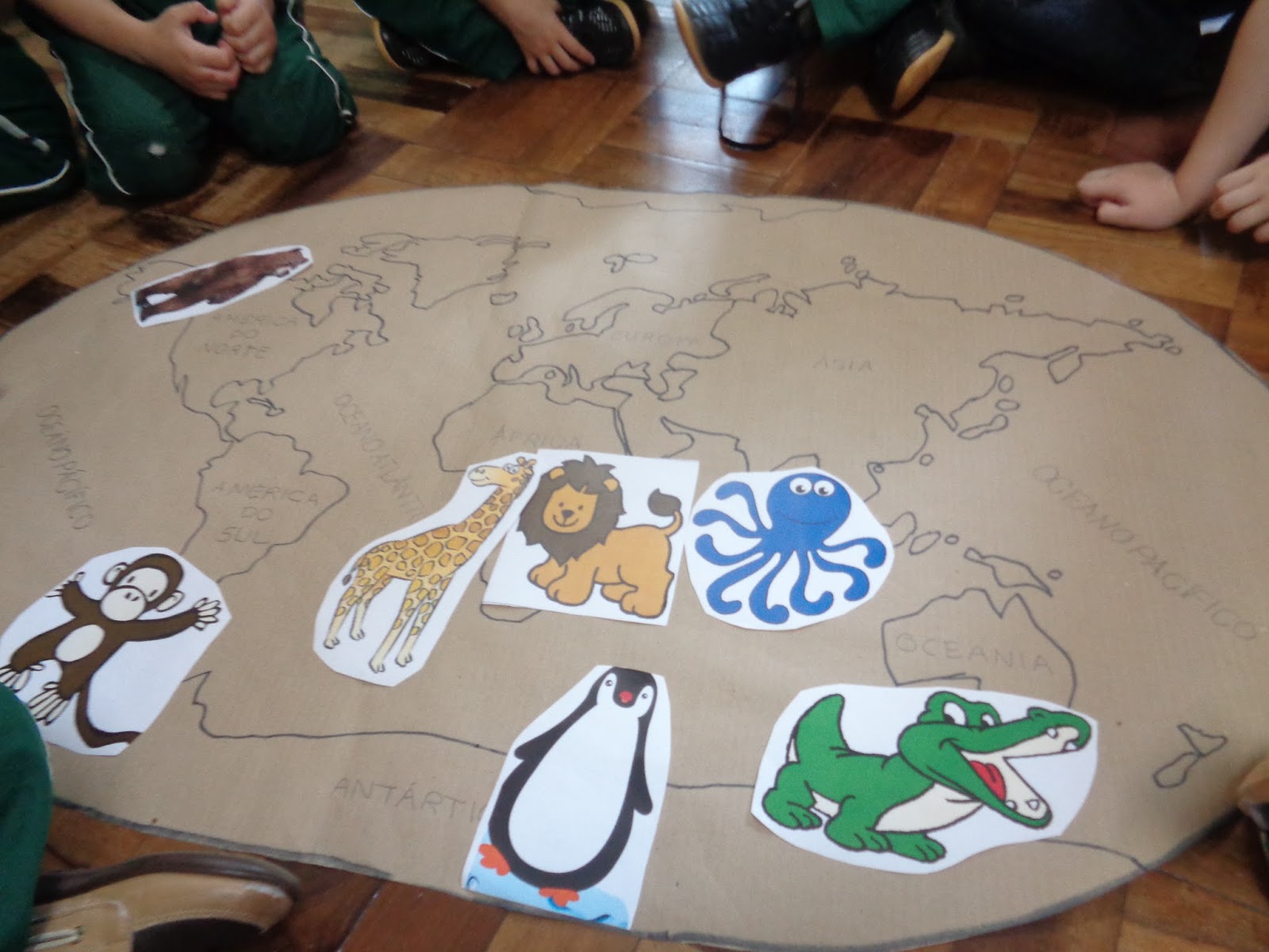 Confeccionar o Mapa-múndi em papel pardo e localizar onde cada animal vive. Conversar sobre seu habitat; alimentação, características, (vertebrados, invertebrados...) classificação (mamífero, aquáticos, aéreos, terrestres,...) cuidados...